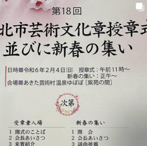 第18回仙北市芸術文化章授章式 2024 2/04 田口ともあきフロントライン 2024年2月4日2024年2月11日 この投稿をInstagramで見る 田口 知明(@tomoaki451006)がシェアした投稿 田口ともあきフロントライン この記事が気に入ったら フォローしてね! Follow Me よかったらシェアしてね! URLをコピーしました! URLをコピーしました! 小正月行事 多くの紙風船が夜空を彩る 関連記事 新年あけましておめでとうございます 2026年1月5日 4年ぶりの初登庁、そして新たなスタート 2025年10月23日 一期目の締めくくり、未来へ新たな決意 2025年9月16日 国・県・市が連携し、豪雨災害からの復興へ 2025年9月7日 早めの避難をお願い致します。 2025年8月27日 一丸となって頑張って参ります! 2025年8月24日 仙北市上桧木内地区に緊急安全確保を発令 2025年8月20日 台湾へのトップセールス 2025年8月20日
